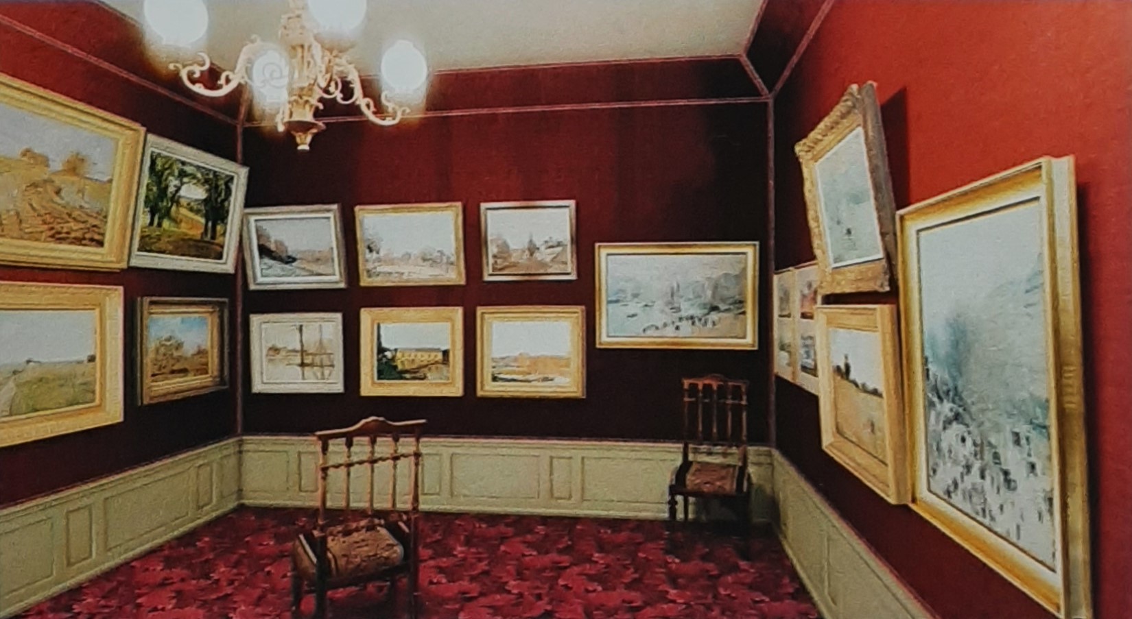 The reviews (=Rv) partly discribed how the works were displayed. The art-works were displayed in several rooms on two floors (Rv4+9;R410,p62). One review mentioned 7 or 8 rooms (Rv3), one 3 or 4*, one mentioned 6 (Rv13). Two rooms on the first floor were separated by a partition wall (R410,p62), so it can be seen as 3 and as 4 rooms. On the second floor 1 small room was probably the former photographer’s laboratory (R410,p62), maybe this wasn’t counted by Silvestre (Rv13). According to Burty the walls were brown-red (Rv1), there were draperies (Rv17) and at dusk there was gas lightning (Rv34). The paintings were hung in 1 or 2 rows (Rv4+6+25), the small ones beneath the large (Rv25). All this is nicely depicted in the Immersive experience↑.