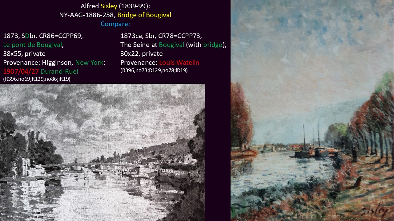 Sisley often depicted Bougival, mostly along the Seine; many of them owned in 1886 by Durand-Ruel. So, indentification is almost impossible. But, in 1875 Durand-Ruel bought at the Hôtel Drouot auction this work: HD1875/03/24-54, Bougival (33×46) (R88II,p451), so with the same title. One of the works I render there to compare, namely CCPP70, I now also use as an uncertain option for no.150 from the 1886 catalogue.