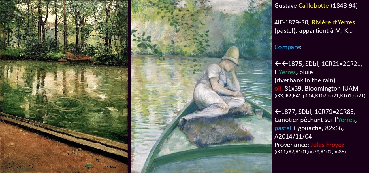 Gustave Caillebotte: 4IE-1879-10, Périssoires = 1877, SDtr, 1CR95+2CR87, Skiffs (Canoeing on the Yerres), 89×116, NGA Washington (iR2;R2,p272;R90II,p105+122;R101,no95;R102,no87+p282;M21) Expos: =? NY-AAG-1886-186, Paddling Canoe; =DR1894-70.