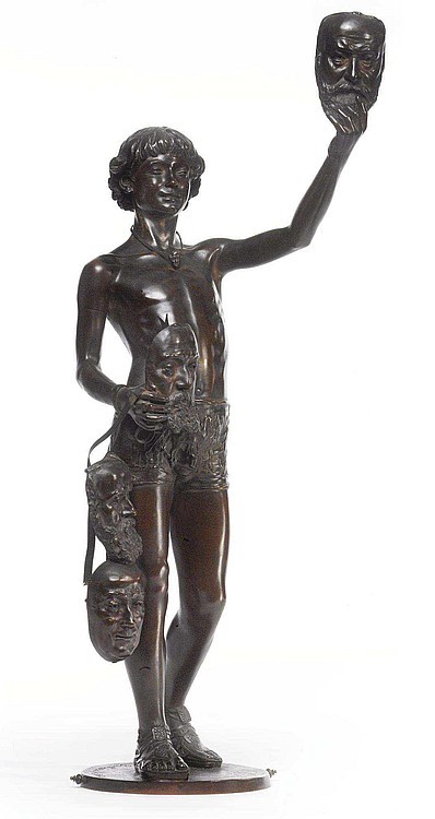 Zacharie Astruc: 1886ca, The Mask seller (small version) (Hugo, Fauré, Gounod & Banville and others), bronze, h85, A2008/10/21 (Kh Bremen) (iR15;iR17;iR1;aR21;M58) Compare: SdAF-1883-3293, Le Marchand de masques; statue, bronze