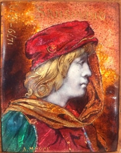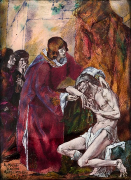 Meyer had rediscovered the technical process that had been used by the old Limousin enamellist in the Middle Ages (iR69;iR4;R9;iR40) of staining / burn-in painting (R3), of transparant colouring (aR12;iR40). Limousin was an old region in the middle of France with Limoges as capital.
