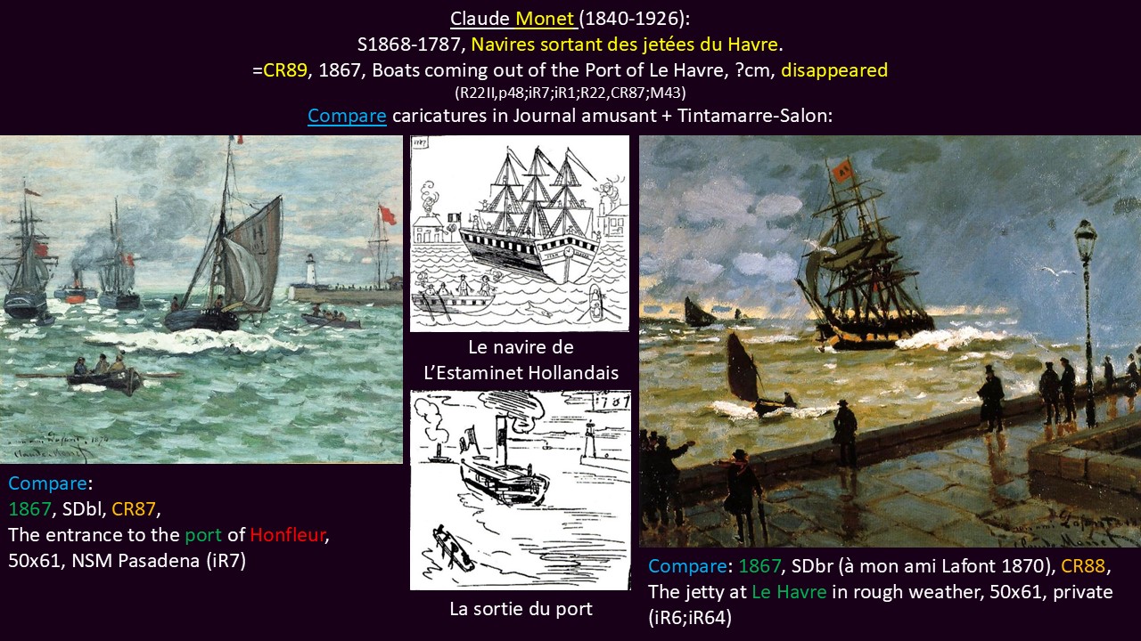 Claude Monet: S1868-1787, Navires sortant des jetées du Havre =CR89, 1867, Boats coming out of the Port of Le Havre, ?cm, disappeared (R22II,p48;iR7;iR1;R22,CR89+88+87;M43). Compare CR87 +CR88 + caricatures.