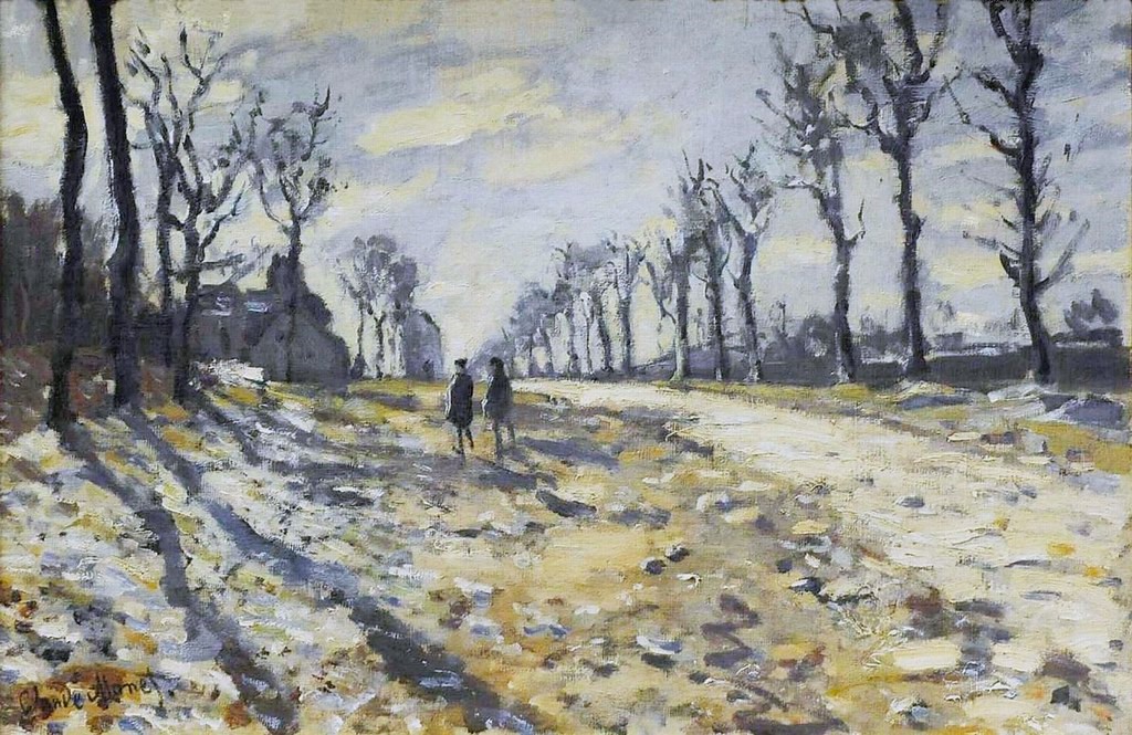 Claude Monet: 1869/12, CR145, Sbl, Route, effet d’hiver, soleil couchant (Louveciennes), 43×65, MBA Rouen (iR10;iR94;R22,no145;M12) Provenance: Armand Gautier; 1889 Boussod, Valadon & Cie; 1889/12 Gustave Goupy; sale HD1898/03/30-26; 1898 François Depeaux; sale GP1906/05/31-30; Durand-Ruel. Expos: Prague-FI-1907-24.