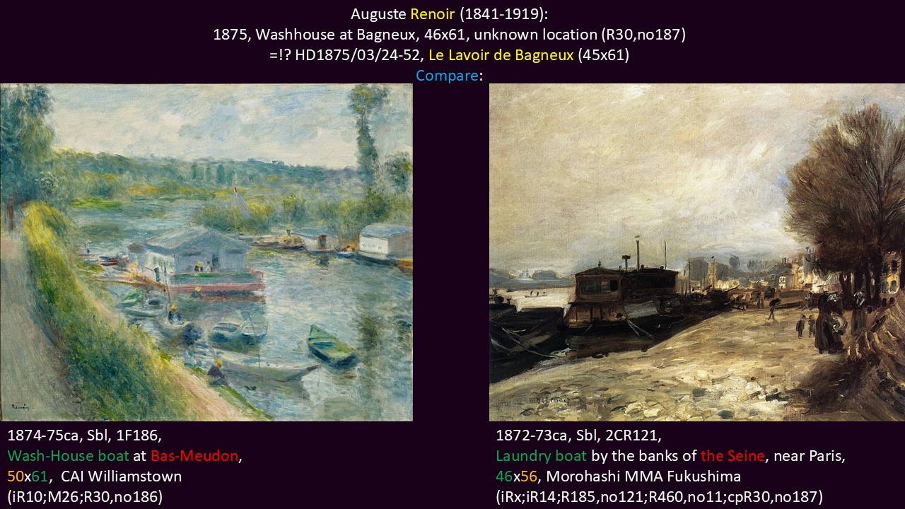 Auguste Renoir: HD1875/03/24-52, Le Lavoir de Bagneux (45×61) (aR1=iR40=R30=R193,no187). Compare: two other paintings with washing boats (R30=R193,no186 +R185,no121). Sold for 100fr to Perrier (R88II,p452).