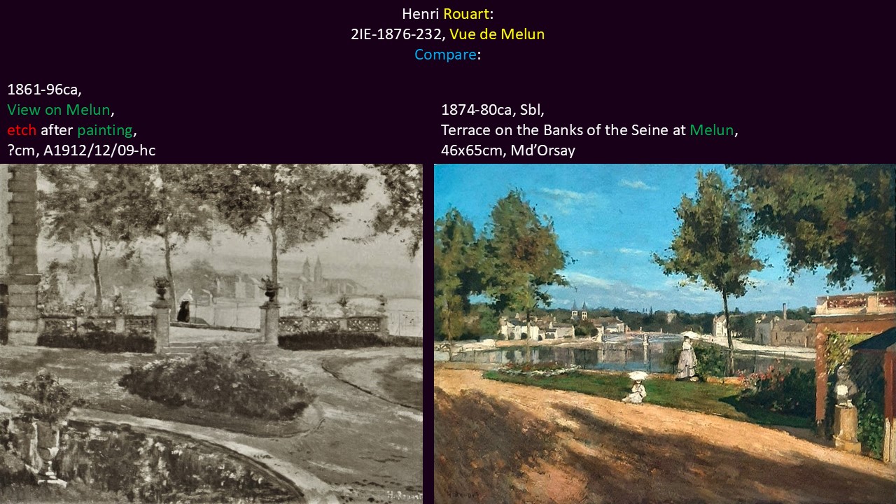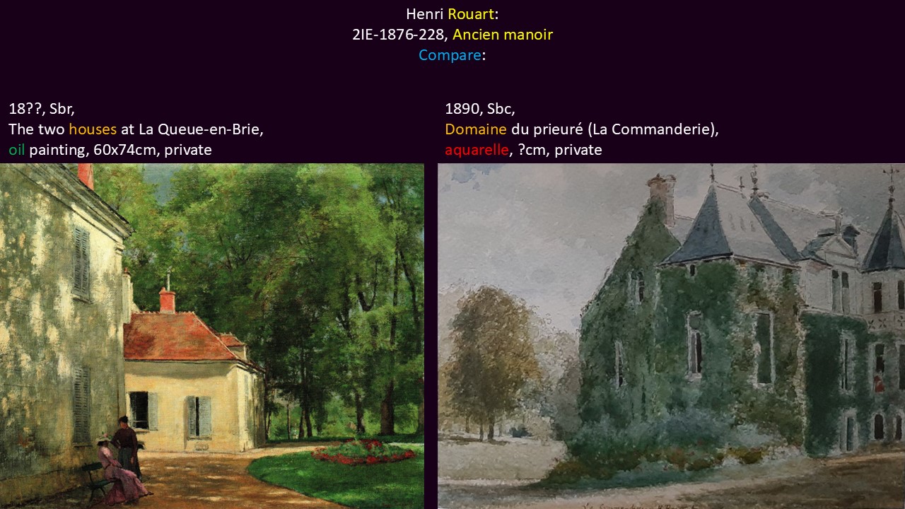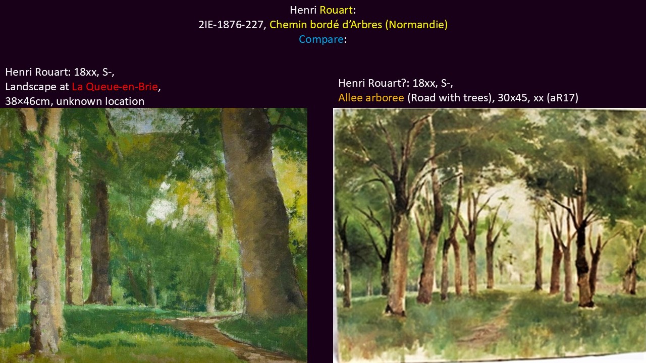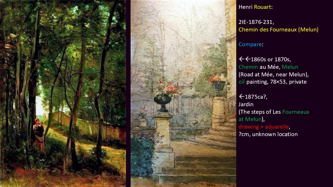 On this page you will find an accounted impression of the 10 art-works that Henri Rouart showed at the 2nd ‘impressionist’ exposition in 1876 (catalogue numbers 227-236). This included 2 drawings. There was just 1 review, rendering a general remark, so identification is very hard. I render to compare compilations of pictures. See my account. For info on the sources see at the bottom of the main page about Henri Rouart. Note: If you double click on the first picture of a group of pictures and then click on full screen, you can create a slideshow. Enjoy!